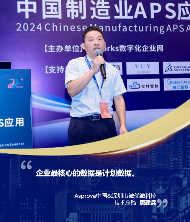 本次论坛上,Asprova中国&深圳市微优微科技技术总监唐建兵带来了精彩发言,不仅现场讲解了APS领域前沿的发展趋势,同时指出“企业 最核心的数据就是计划数据”,强调了生产计划排产对制造企业的重要影响。