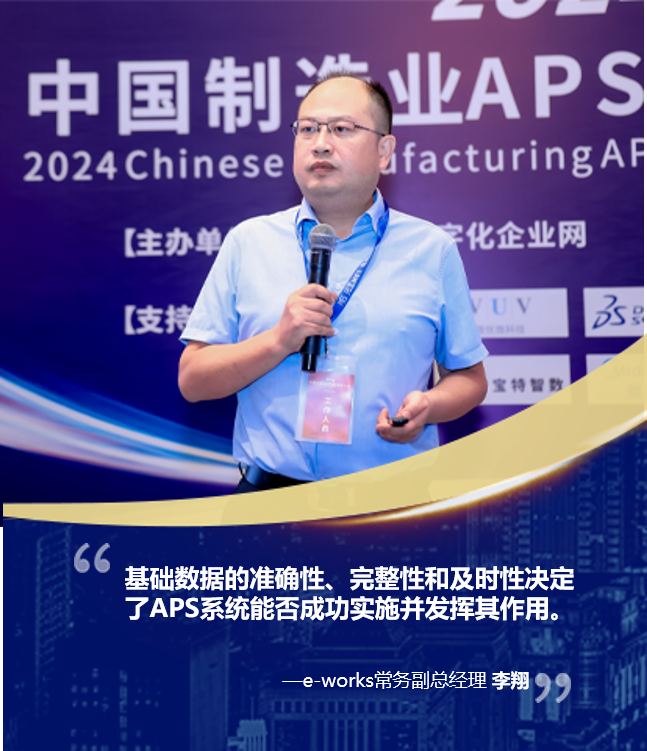 e-works常务副总经理李翔分享了“关于APS的思考”。李总针对计划体系为何关键、APS的应用效果为何不理想、APS如何有效推进三个问题进行了系统性的阐述并提出相应的改进措施。APS的有效推进需要清晰的边界条件、算法的完整表达、基础数据的详尽收集、现场计划的及时变更等因素相互支撑。李总强调,只有在基础数据得到充分保障的情况下,APS系统才能生成高效、精准的生产计划和排程,从而优化企业的生产效率和资源利用率。