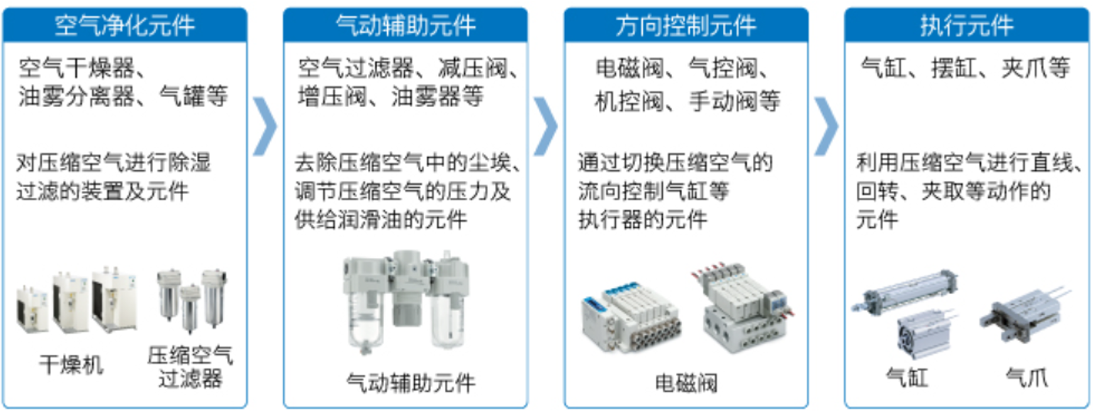 SMC 的产品现已多达12,000种基本型元件、700,000个规格,广泛应用在各个领域的自动化生产中。SMC 的“气动控制技术”正广泛应用于汽车、半导体、电子、机床、食品、包装、印刷、医疗、制药、纺织等基础工业领域中。通过气动技术与尖端技术的融合,即使是在新一代信息技术、机器人、航空航天、新能源、智能制造等最尖端的产业中,气动技术也有着无限发展的可能。在半导体工程、液晶制造、生物医药、医疗器械等高新技术领域,SMC 的产品大显身手,气动技术正在不断扩大新的应用领域。