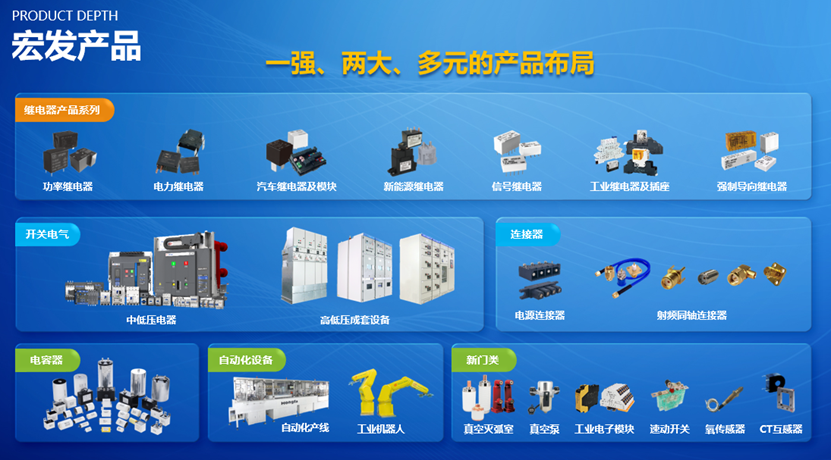 宏发集团全球继电器行业领军者,始创于1984年。宏发产品布局继电器、中低压电器、高低压成套设备、连接器、电容器、精密零件及自动化设备等多个产业板块,拥有30余家子公司,宏发打造含厦漳、东部、西部三大研发生产基地及海外印尼工厂,聚焦产业创新,构筑宏发工业生态系统。