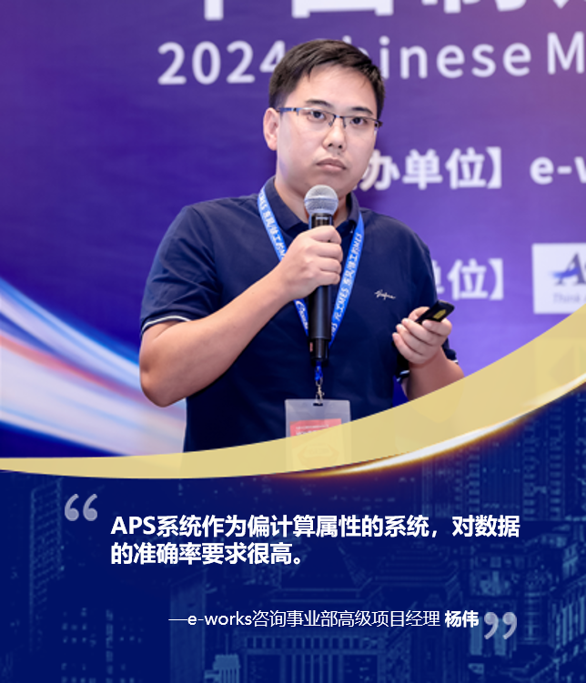 e-works咨询事业部高级项目经理杨伟以“APS助力某大型装备企业打造数字化车间 ”为主题分享了某发电设备企业实施APS的准备工作、核心场景以及成功要素。杨伟提到,企业在面临产品复杂、生产周期长以及计划层级多等痛点时,应通过梳理数据、选择试点、引入监理以及开展POC等步骤分步推进APS,以提高APS应用成功率。同时,他强调,企业工艺数据标准性和一致性,生产加工周期数据的准确性是成功实施APS的关键。