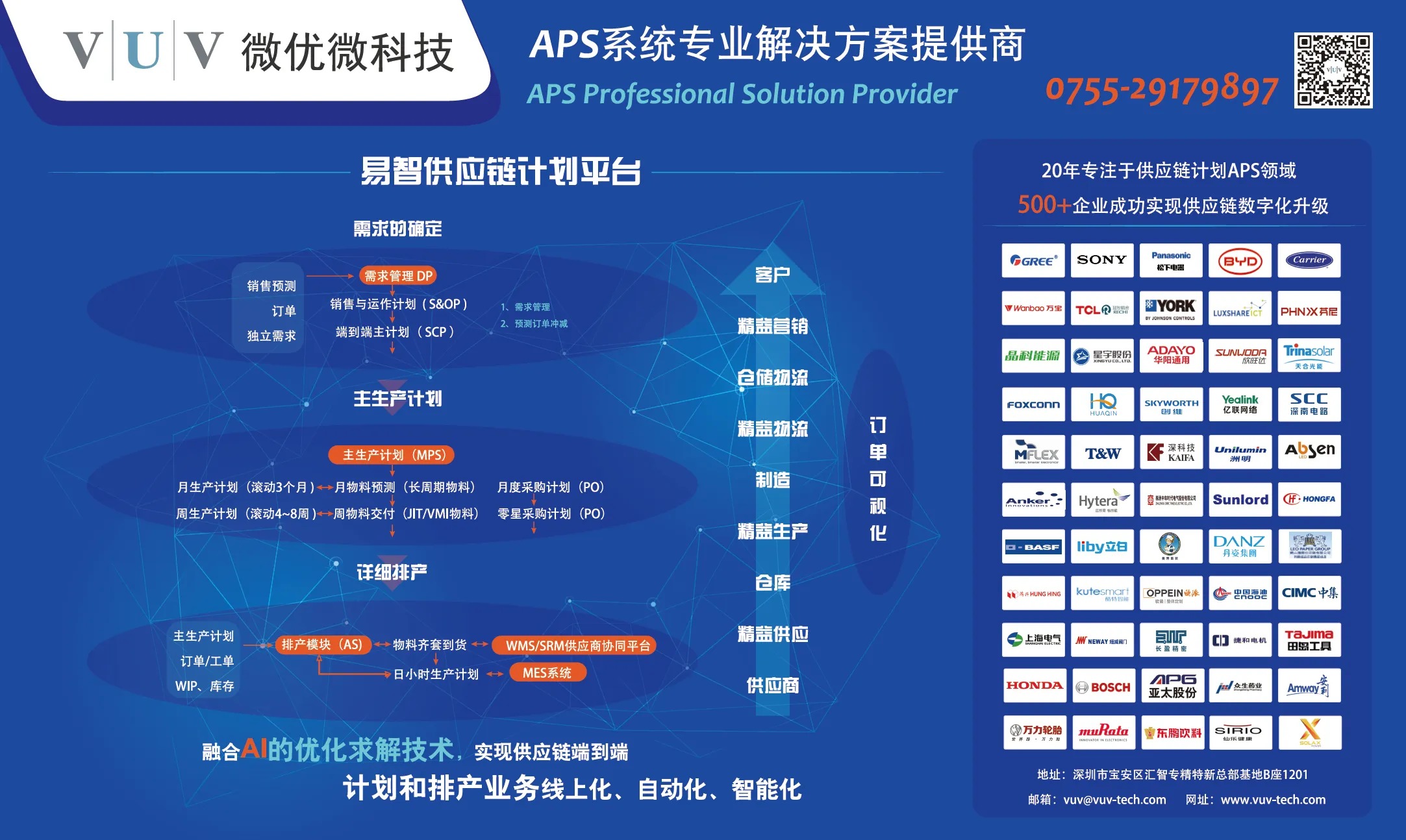 VUV 提供从供应链“可执行的销售预测,S&OP,到生产计划排产,物料计划、供应商协同”等全流程咨询服务, 提供完整的“集成供应链咨询+IT系统落地”(ISC+APS)解决方案。使企业在“销售预测不确定、订单周期短、波动大”的市场环境下,在“交付、成本、品质” 方面,快速铸造核心竞争力,实现行业领先!