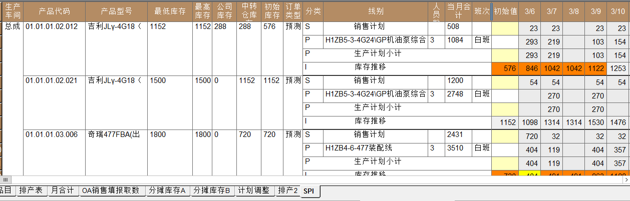 (1)基于OA订单类型和预测类型不同类型需求以及建立安全库存基准,以满足交货为前提、减少切换、以MES组线标准节拍正向有限产能,实现装配生产计划自动排产。除满足交期外,实现安全库存自动补充,并根据不同中转仓库的安全库存分摊排产。并根据毛坯、外购件、产线人员不足情况,自动快速调整计划。