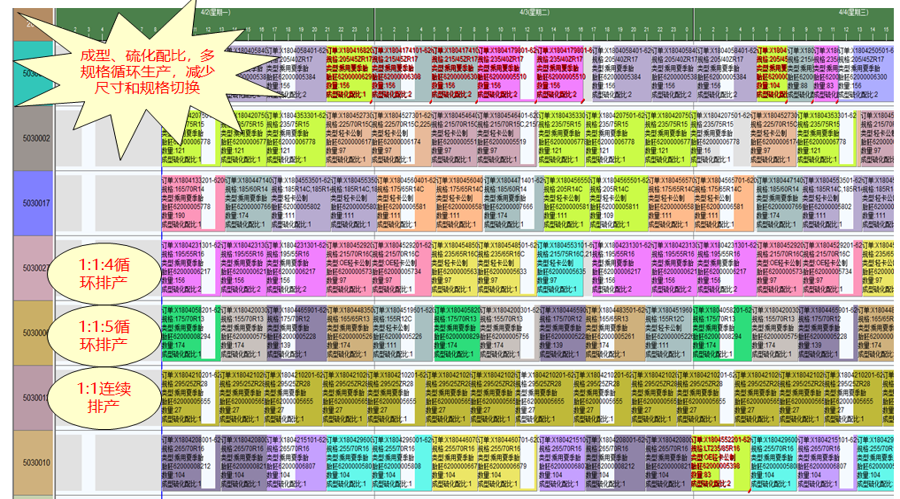 1.主计划基于瓶颈工序成型排产,考虑硫化的模具数量,根据成型和硫化的定额算出成型的生出你规律,同规格、同尺寸尽量排一台机,减少换工装,