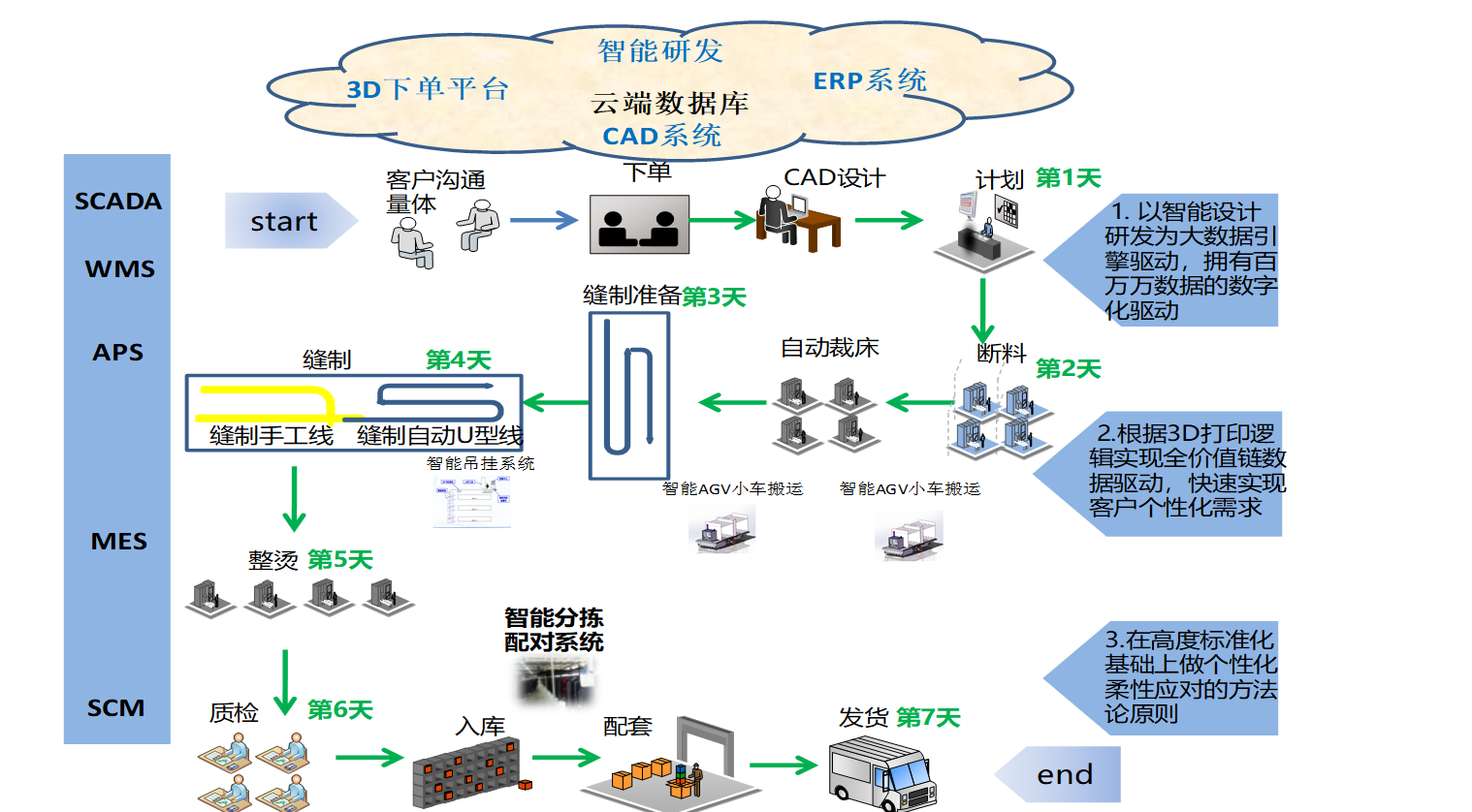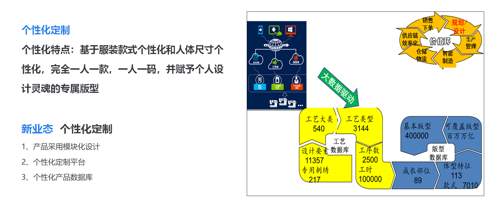 个性化定制的特点是在款式颜色尺码做了模块化的扩展,脱离了传统的 款色码编码的管理,通过模块化的管理形成数据库,支撑柔性化的生产以及智能化的自动化的生产过程