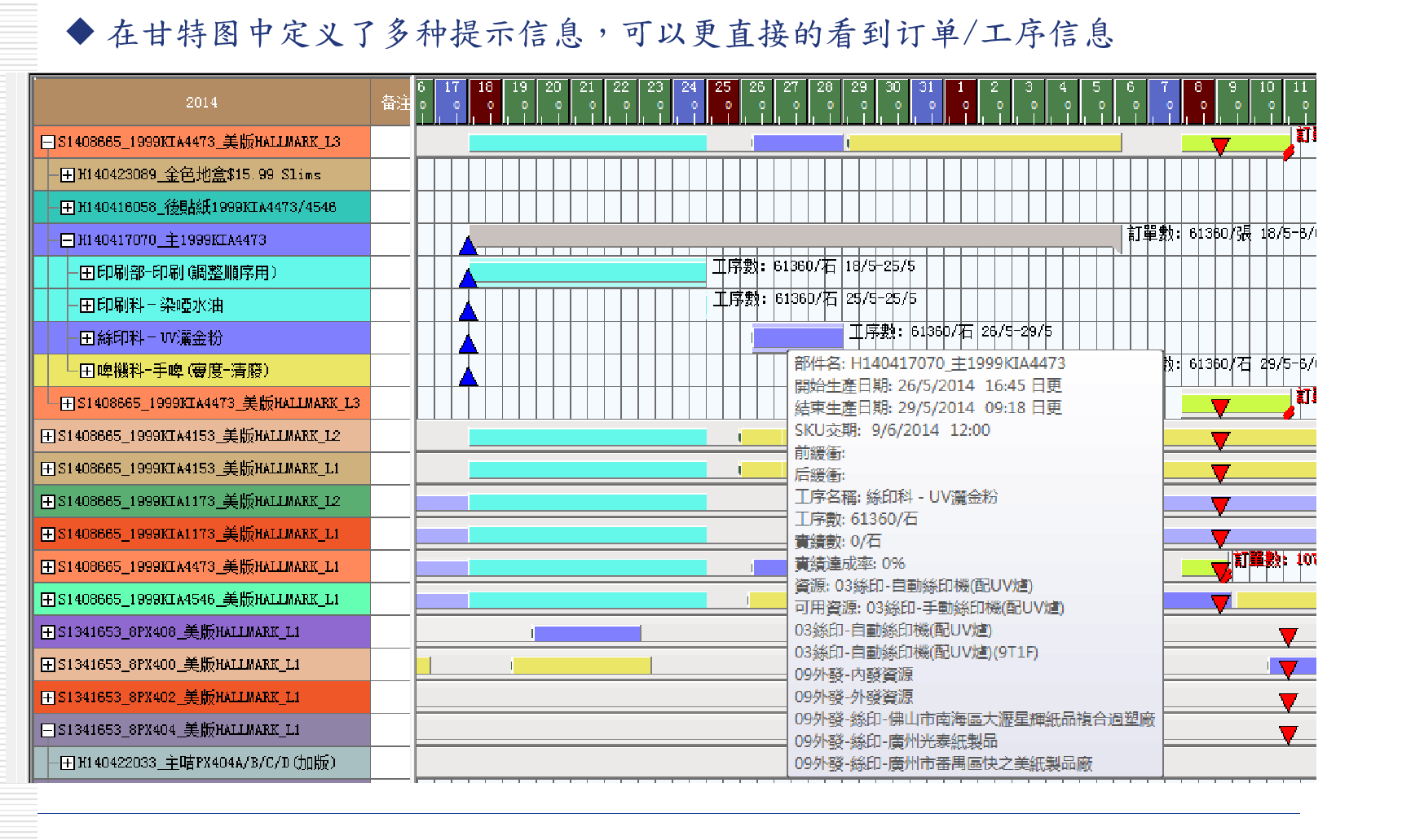 2.模拟排程,主计划排程,答复交期。APS根据产品BOM的工艺段,工艺序,工作中心产能,生产日历等设置,快速模拟试算,得到工单的计划开始/结束时间,以及工单每道工序精细化的计划开始/结束时间,机台安排等等,便于计划员答复工单的交期,且可以通过甘特图展示工单的计划。
