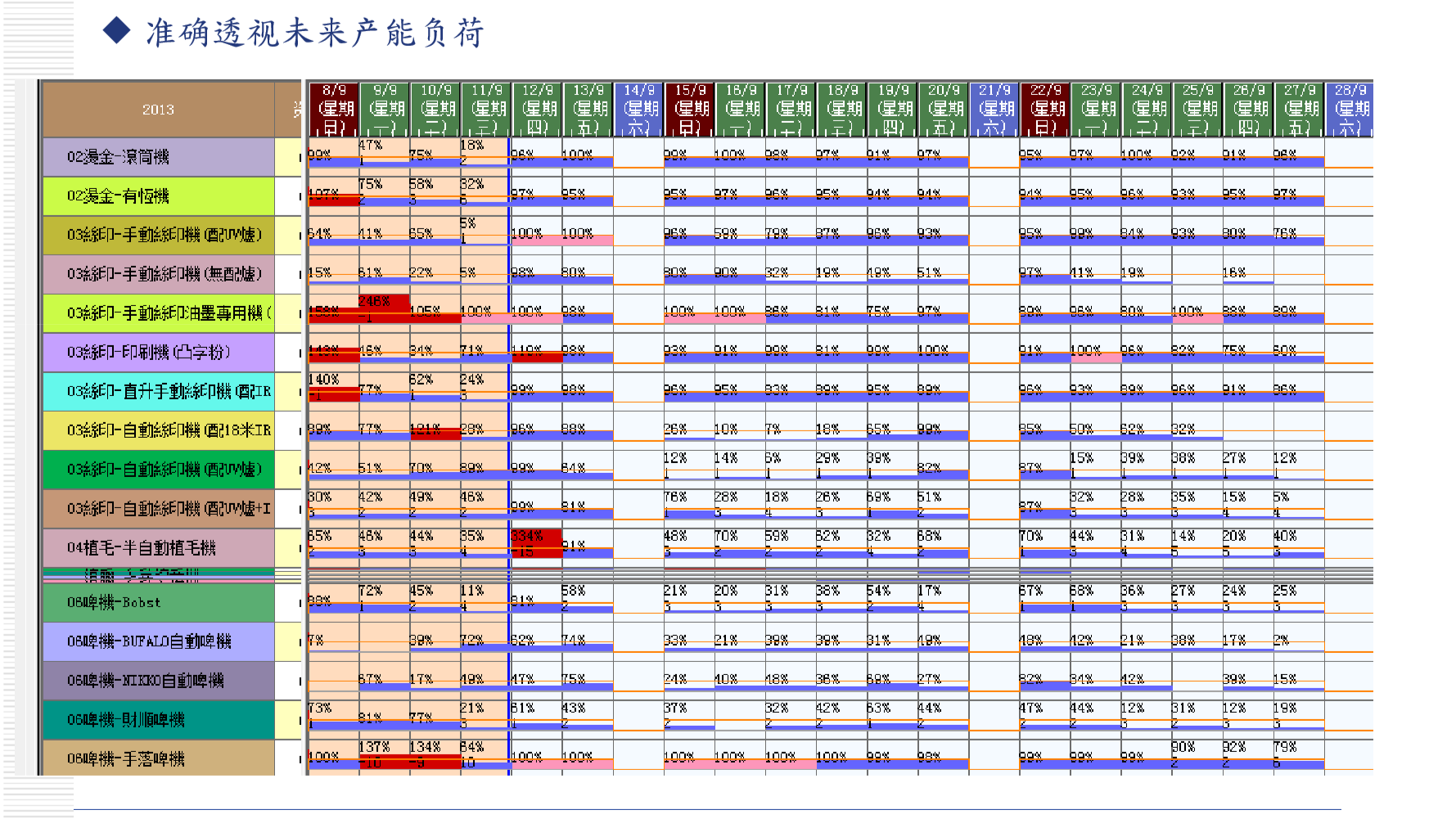 6.动态产能负荷/机台有效产出:APS自动生成机台的负荷/产出报表,便于管理层及机长了解计划期间每天的负荷情况,了解车间动态产能情况。