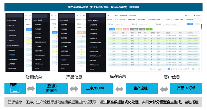 人员工种基本资料、客户档案信息、设备基本资料、设备组基本资料、产品BOM、工艺BOM、工序设备、工序设备人员工种、工序模具、设备产能、灵活配置产线产能、产品检验信息定义各原辅料、中间产品、成品的检验项目,能够设定各项目对应规则及资源,包含但不限于所需人员、设备、 检验耗材数量、各类样品的有效期、样品前处理时间、检验时间、后处理时间等。