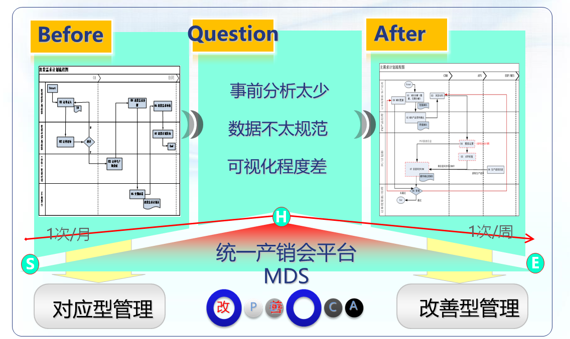APS项目的运行使用,引入了MDS主需求计划的概念,建立了基于APS-MDS的产销协同模式,克服了传统产销会事前分析太少、数据不规范、可视化程度差等弱点,增强了数据分析能力,使得产销协同数据系统化、实时化,也改大大提高了排产需求数据管理的规范化程度。 同时以主计划MPS推动需求数据MDS的不断更新,由之前1次/月产销协同会议提高到现在的1次/周,大大降低了因数据更新不及时造成的风险。