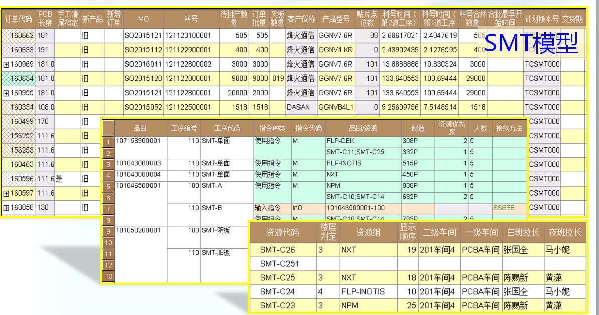 基于ERP工单,针对SMT、DIP、网关、光通、自制件等各工段协同作业排程,同时将工作指令自动下发到MES,进行无缝集成。